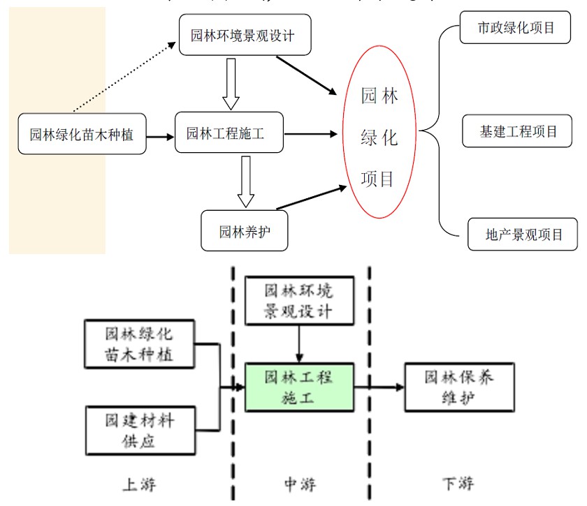 从项目性质可分为市政园林、地产景观、度假园林和生态景观四类。从具体的时间顺序上看,园林规划包括园林绿化苗木种植、园林环境景观设计、园林工程施工和园林养护等四个方面。园林绿化项目一般先由设计师进行方案设计,再由施工方进行工程施工,工程完工后进入养护期。园林绿化苗木种植主要为园林工程施工服务,同时绿化苗木的品种和资源对设计师的设计方案会有一定的影响。